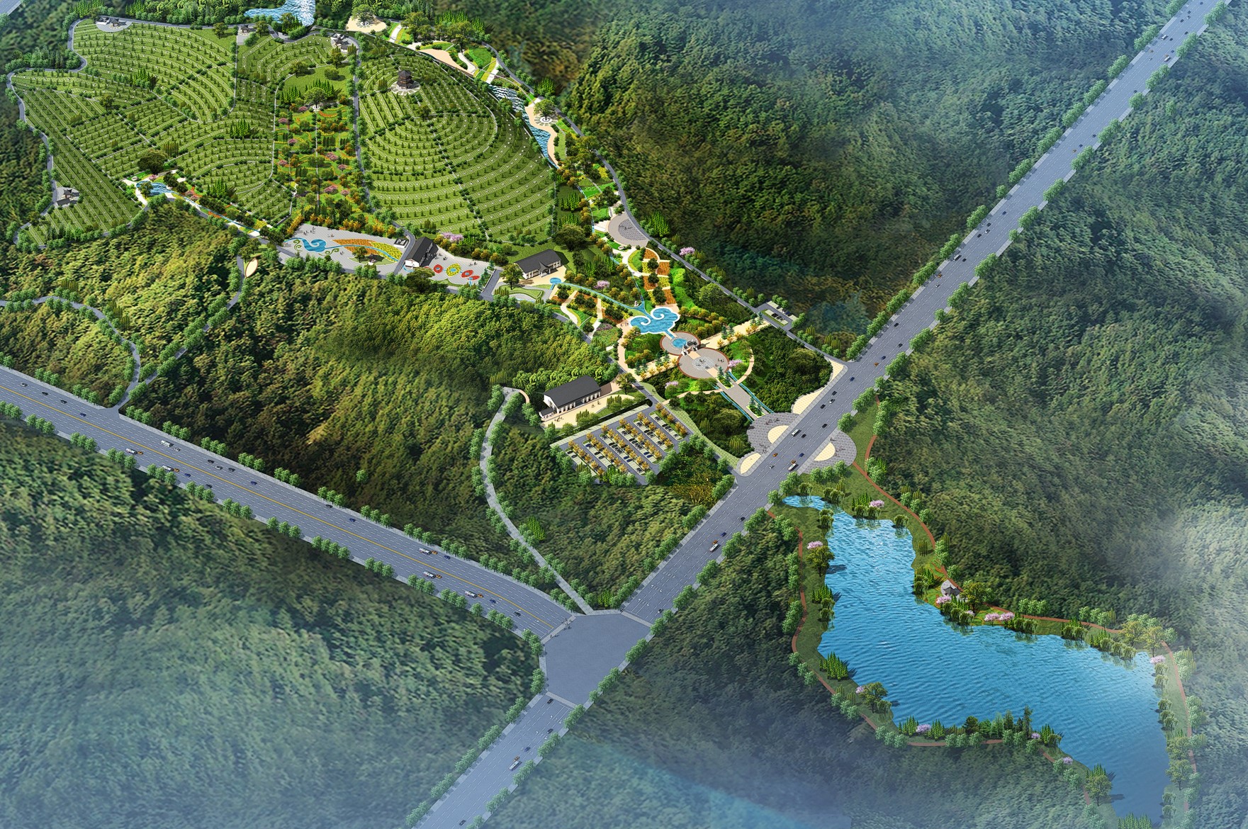 德龍陵園來龍于昆侖山系,屬翠峰山主脈延伸到石馬龍山的團山結(jié)穴而建,面朝小閘水庫,太和山與寥廓山左右環(huán)抱,園區(qū)巒聳翠、水映霞輝、山環(huán)水繞、郁郁蔥蔥,有五龍捧圣之勢,冠以五福臨門之愿,五德傳承之感,使山水人文融為一體,是弘揚中華文化的教研基地。